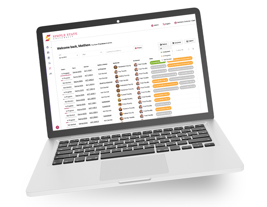 Simple Prep seamlessly fits into your existing technology ecosystem. Engineered from the ground up to leverage the data within your SIS, LMS, Simple Syllabus, and other systems, Simple Prep's data model is customized to your institution during the implementation process to accelerate integration and reduce the workload on your technical staff.
